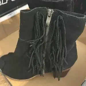 Black Suede Toeless Side Zipper with Western Fringed Detailing down the side Bootie Cody Design by Mia Women’s Size 9.5 3 1/4 in brown block wooden heel wore once and in great condition